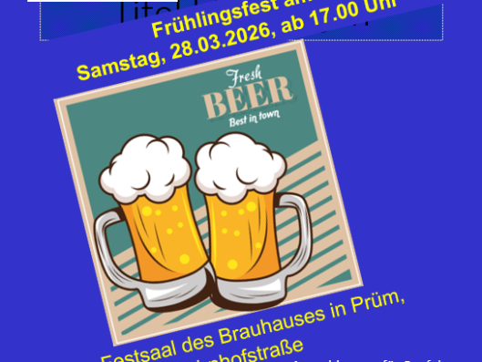 wenn sich genügend anmelden werden wir zu unserem Frühlingsfest am Samstag,28.03.2026, einen Bus von Bitburg nach Prüm einsetzen. Abfahrt ist um 16.30 Uhr auf dem BEDA-Platz in Bitburg. Gegen 24.00 Uhr ist Abfahrt vom Brauhaus geplant.